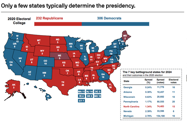 The outcome of the 2024 US presidential elections will likely come down to just a few thousand votes in a few pivotal swing states, mirroring the close outcomes of 2016 and 2020. There are 538 electoral college votes available, and 270 are required to win. Most election experts have distilled this race to 7 battleground states, where the margin of victory is expected to be fewer than 500k votes. Those key battleground states are Arizona, Georgia, Michigan, Nevada, North Carolina, Pennsylvania, and Wisconsin.