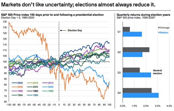 - Markets do not like uncertainty, and elections foment uncertainty. Typically, in the lead-up to an election, markets face headwinds from this uncertainty.