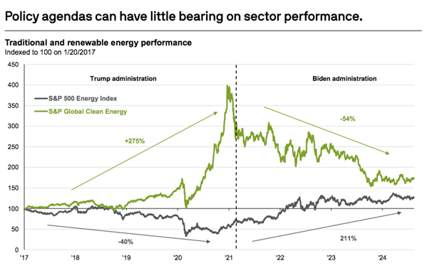 - Sector performance was the opposite of what one might expect. Under Trump, the S&P 500Energy index was down -40%, while the S&P 500 Global Clean Energy index was up 275%. UnderBiden, the S&P 500 Energy index nearly doubled, while the S&P 500 Global Clean Energy indexwas down -50%.