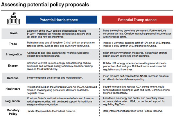 - While Harris joined the presidential race later in the election cycle, her platform is unlikely to differ much from Biden’s. However, each candidate’s policy positions are subject to change as the election cycle progresses, and again once elected in office. There is also no way to know which policies would be prioritized or successfully passed through Congress once in office— suggesting investors will want to take campaign rhetoric with a grain of salt.