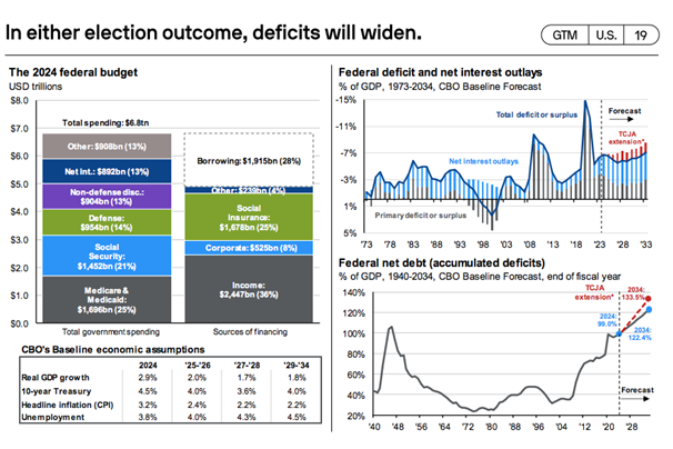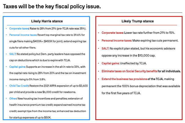 - However, many provisions in the 2017 TCJA Act are set to expire at the end of 2025, giving whoever is elected to the White House a chance to reset fiscal policy.