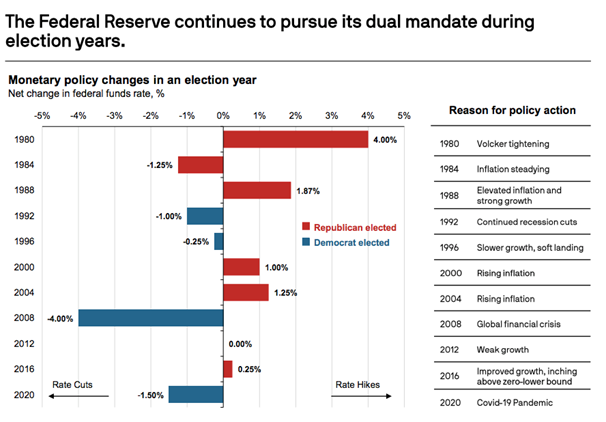 - Historically, the Fed doesn’t sit on the sidelines during election years, but rather continues to pursue its dual mandate of price stability and maximum employment, while maintaining its independence from politics.