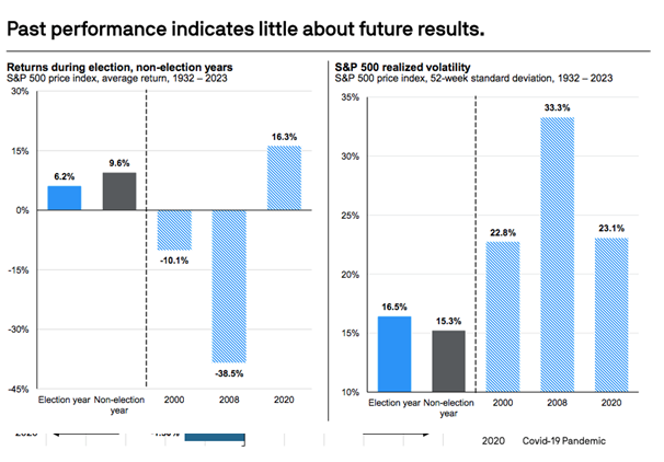 - However, averages don’t tell the full story, as recent presidential election years have been particularly volatile with historic market drawdowns.