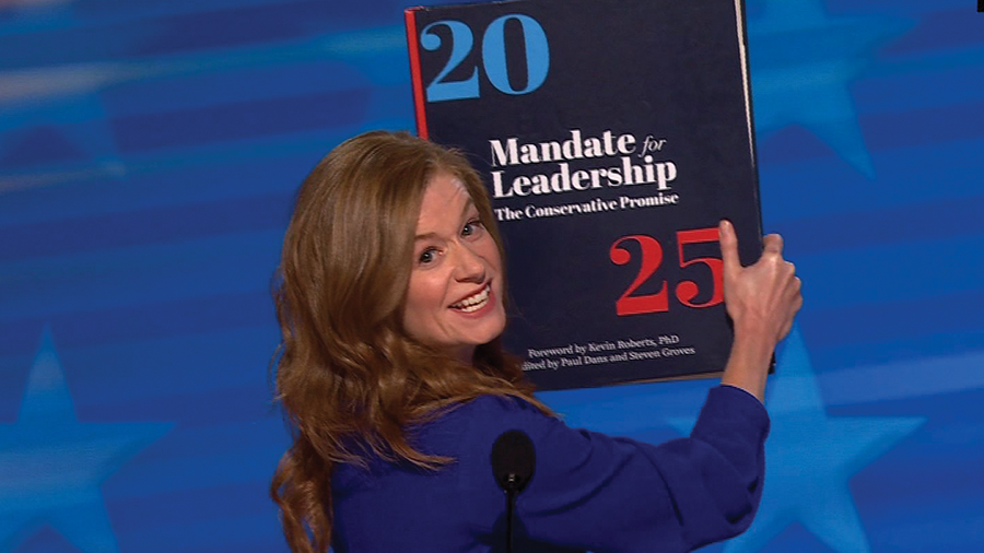 Michigan State Sen. Mallory McMorrow brought out a large copy of Project 2025, what she described as a “Republican blueprint” for former President Trump’s potential second term. She warned those in attendance that the policies it lays out are “so much worse” than what they may have heard. (Image-NBC news)