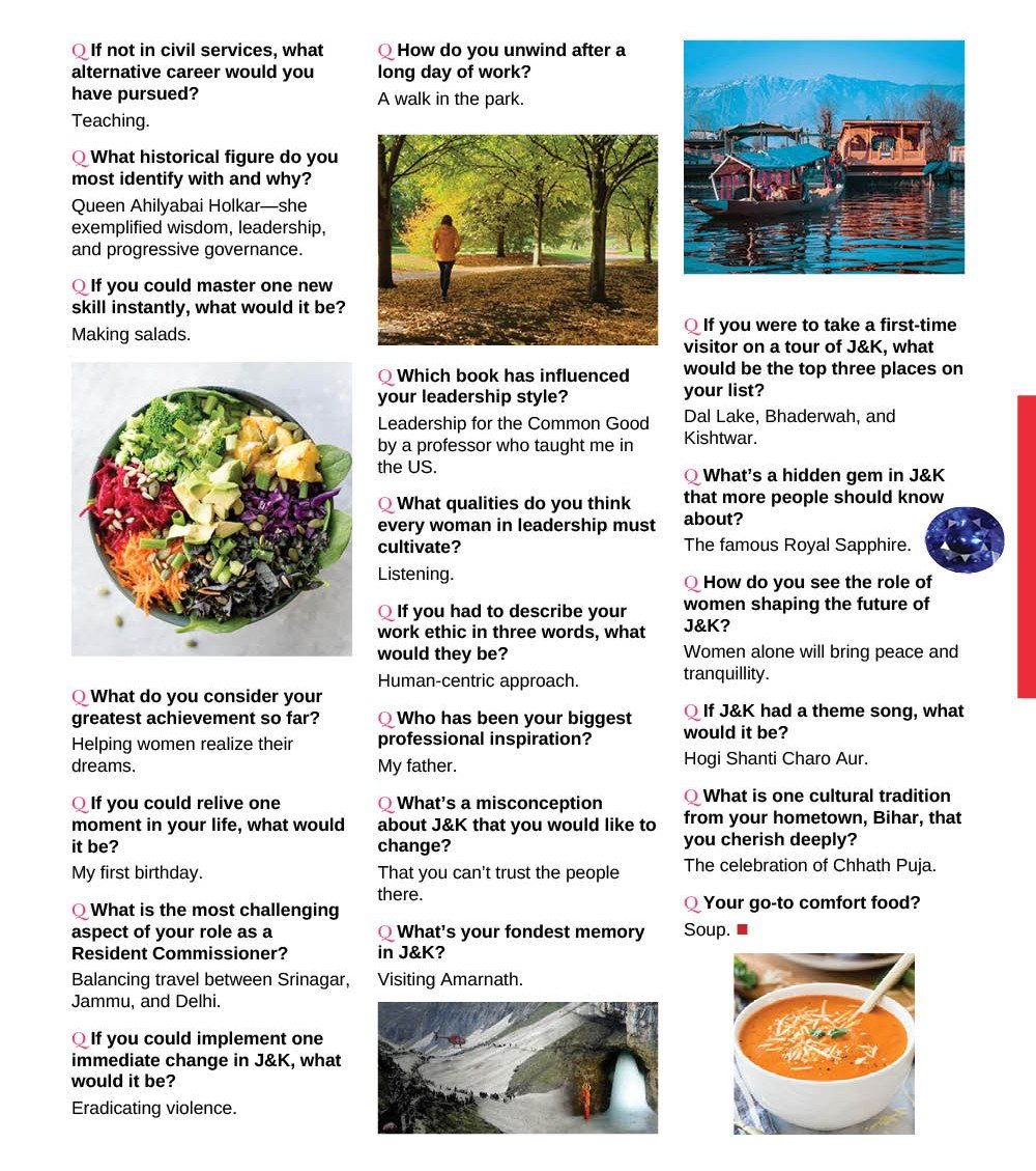 Dr. Rashmi Singh, an IAS officer and the Principal Resident Commissioner of Jammu and Kashmir in Delhi, is a leader committed to social transformation and governance with a human-centric approach. With a career dedicated to empowering women, fostering peace, and dispelling misconceptions about J&K, she embodies resilience and vision. In this Proust-style interview, she shares her insights on leadership, her deep connection with J&K, and the values that drive her mission. From her admiration for Queen Ahilyabai Holkar to her belief in the power of women to shape the future, this conversation offers a glimpse into the mind of a changemaker who envisions a peaceful and prosperous Jammu and Kashmir.