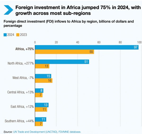 Foreign investment in Africa surged by 75% to reach an all-time high of $97 billion in 2024. This surge was initiated by liberalisation and facilitation efforts across the continent, according to the United Nations Conference on Trade and Development (UNCTAD). This remarkable growth stands in stark contrast to the global investment climate, where FDI flows faced significant headwinds due to current geopolitical tensions and economic uncertainties. The recovery is particularly noteworthy when compared to Africa’s 2023 performance. FDI inflows to Africa declined by 3% to $53 billion in 2023, making the 2024 surge even more significant. With renewed investor confidence, the investment recovery has been driven by multiple factors, including improved policy frameworks, infrastructure liberalisation, and strategic positioning for the global energy transition. Greenfield investment announcements included mega projects like a green hydrogen project in Mauritania, highlighting the continent’s growing role in renewable energy development.
