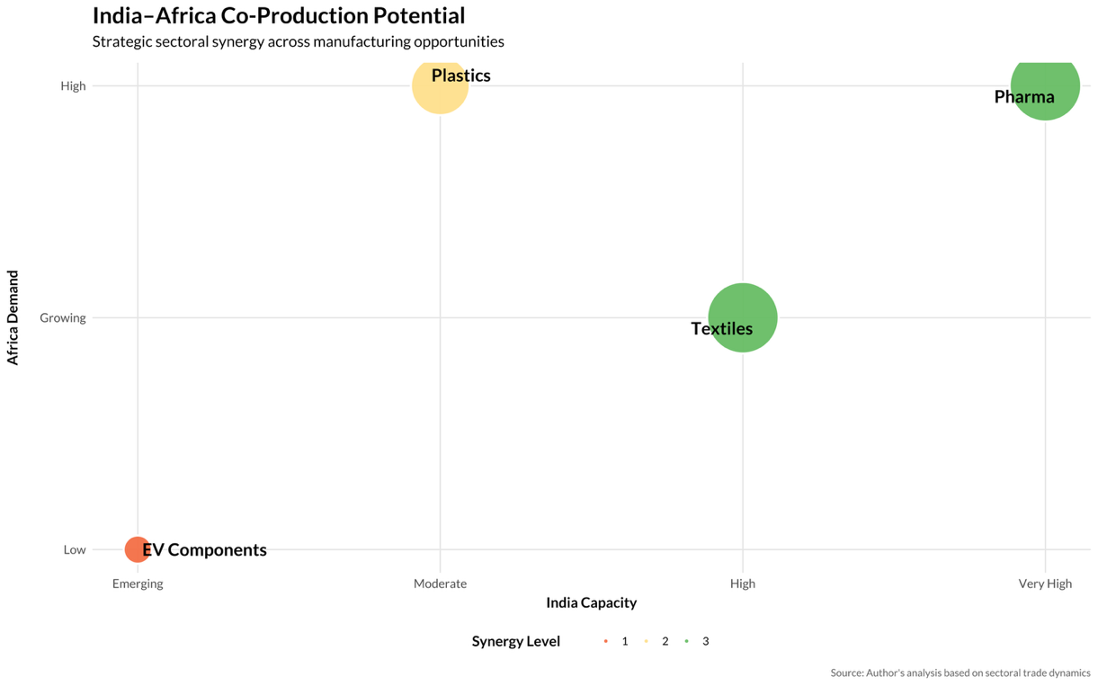 The bubble chart above shows the potential for India and Africa to collaborate in different sectors.It compares India’s ability to manufacture products with Africa’s need for them.Pharmaceuticals and textiles are the top sectors because India can produce a lot, and Africa needs them.This makes them suitable for joint projects and technology sharing.Plastics are in the middle but still have good chances because more Africans are buying packaged products.Electric vehicle parts are not performing well because Africa does not need them yet, and India is just starting to manufacture them.The chart suggests focusing on strong sectors and slowly building new ones.