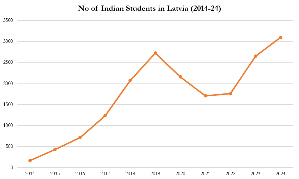 Among the CEECs, Latvia has emerged as a particularly appealing destination for international students, notably those from India. Despite the challenges posed by COVID-19 in between, there has been an overall rise in the number of students from 164 in 2014 to 3,089 in 2024 as per the Official Statistics of Latvia. The rationale for this increase lies in a variety of economic, academic, and cultural factors. Low tuition fees – 30 percent lower on average than those in Western Europe, combined with lower living costs, make Latvia financially viable for Indian students. The availability of English-taught programs and a growing presence of Latvian higher education institutions in international rankings further enhances its appeal. Latvia’s reputation as a scenic, safe, and culturally rich country also contributes to its growing popularity among Indian students (Kirloskar & Inamdar, 2024).